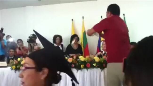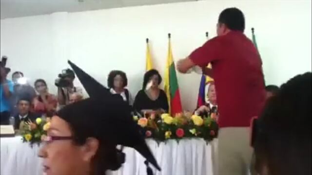 Algunos de los padres de familia se pararon frente al rector quien presidía la mesa principal y procedieron a romper los simulacros de los diplomas en el salon de eventos del Centro Tutorial del municipio de San Juan Nepomuceno