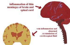 Ilustración del cerebro normal y el cerebro con mas meninges inflamadas.