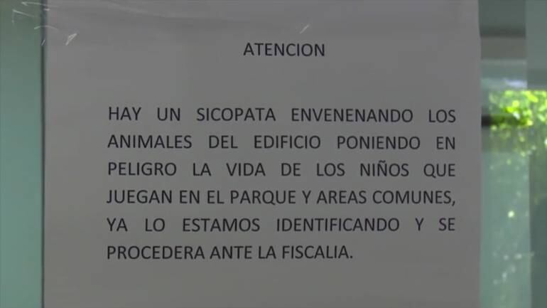 En algunas paredes del conjunto hay avisos de advertencia que rezan: “Hay un psicópata envenenando los gatos del edificio poniendo en peligro la vida de los niños que juegan en el parque y áreas comunes ya lo estamos identificando y se procederá ante la fiscalía.”