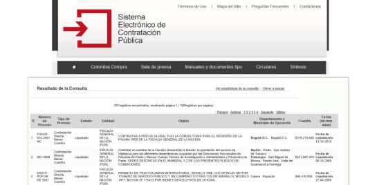 El domingo en la noche en el SECOP a la Fiscalía le figuraban más de 3.034 registros consignados en 61 páginas. En la número 1, aparecía la información de contratos del año 2015 y en la última, la número 61, los contratos del año 2008, cuando el Fiscal era Mario Iguarán.