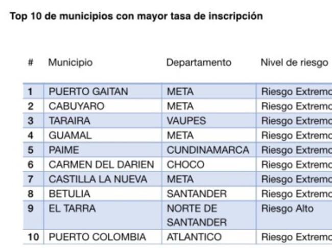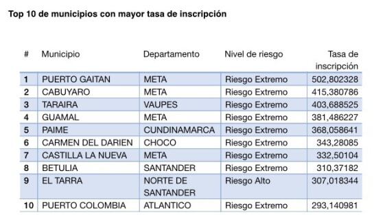 Municipios críticos en la variable de inscripción de cédulas, el top cinco de municipios con mayor tasa de inscripción de cédulas es: Puerto Gaitán con 502,80 inscritos por cada mil habitantes encabezando la lista, seguido de Cabuyaro con 415, 38 en el departamento del Meta; Taraira, con 403.68 (Vaupés), Guamal 381.48 (Meta) y Paime 368,05 (Cundinamarca), mientras que el promedio nacional es de 98,31 inscritos por cada mil habitantes. Es decir que estos municipios triplican la tasa nacional y en el caso de Puerto Gaitán la tendencia es mucho más crítica.