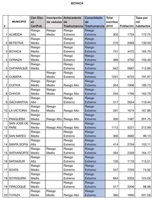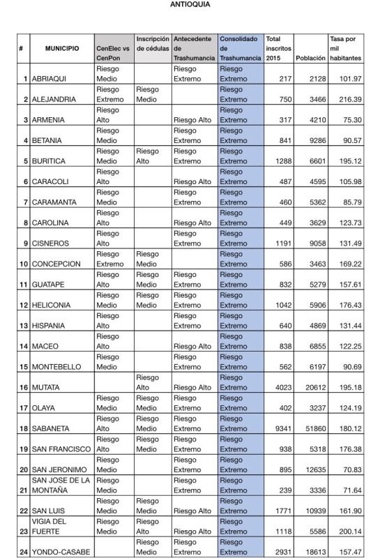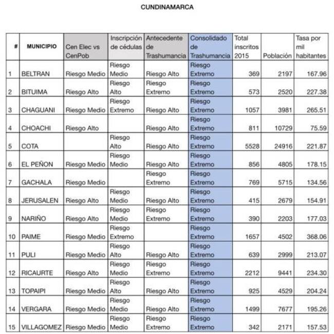 El riesgo consolidado por factores indicativos de presunta trashumancia se mide a través de tres variables: el nivel de censo electoral, la inscripción de cédulas para estas elecciones y los antecedentes de trashumancia. Cabe anotar que en la variable de antecedente de trashumancia, se realiza gracias a una medición de la Registraduría Nacional del Estado Civil, en la que se analiza el porcentaje de cédulas inscritas anuladas por el Consejo Nacional Electoral en 2011.