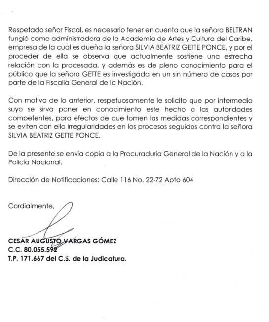 Se trata de Elfi Beltrán Flórez, exadministradora de la Academia de Artes y Cultura del Caribe, empresa de la que es dueña Gette. Por eso le solicitó a la Fiscalía que tome medidas para proteger al testigo, esa solicitud también fue elevada a la Policia y a la Procuraduría General.