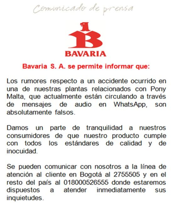 En un comunicado dado a conocer este miércoles la empresa Bavaria desmintió el falso rumor que circuló en redes sociales, entre ellas WhatsApp, sobre la muerte de un hombre ahogado en un tanque de almacenamiento y la aparición de elementos extraños dentro de una bebida tradicional de la compañía. Este es el texto del comunicado: