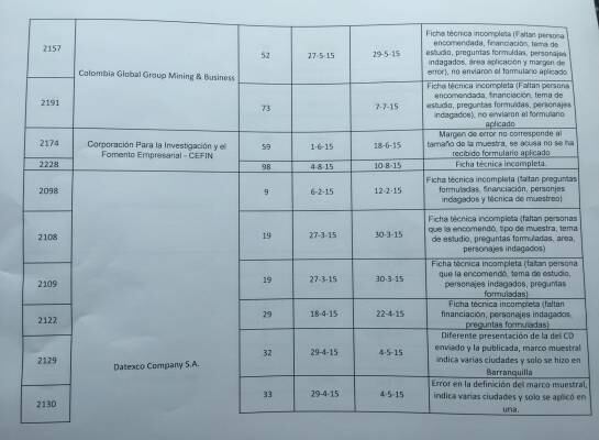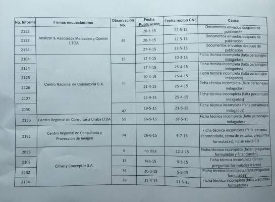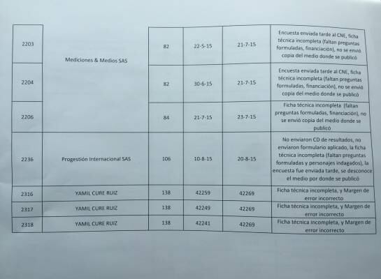 Según los magistrados estas encuestadoras no enviaron las fichas técnicas completas al CNE, no informaron sobre quién financia las mediciones y en general que posiblemente omitieron detalles de las muestras.