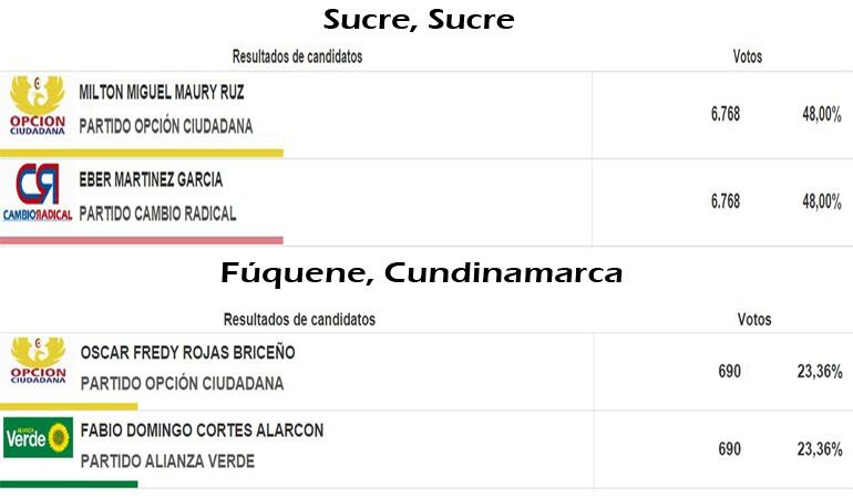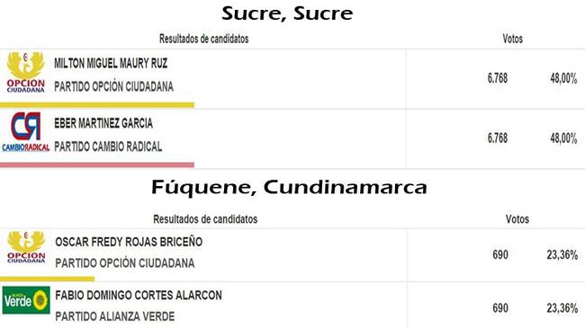 Los candidatos empatados en Sucre con 690 votos son: Milton Maury Ruz, de Opción Ciudadana y Eber Martínez García, de Cambio Radical. Los aspirantes empatados en Fúquene con 6.768 votos son: Oscar Rojas, de Opción Ciudadana y Fabio Cortes, de los Verdes.