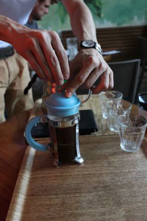 Luego de esperar un tiempo prudente, se comienza a presionar de manera lenta el émbolo hacia abajo para separar así el agua de los granos, teniendo en cuenta que, finalmente, algunos pequeños residuos terminarán en la bebida, y es ese detalle lo que le brindará amargura, intensidad, dulzura o hasta sabor chocolate al café final.