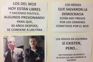 Los carteles instalados por el Centro Democrático tienen imágenes del día de la toma, las caras de los oficiales Plazas Vega y Arias Cabrales y varios mensajes en lo que recuerdan el número de víctimas durante los hechos y se hacen reclamos por la situación jurídica de los militares que participaron en la retoma.