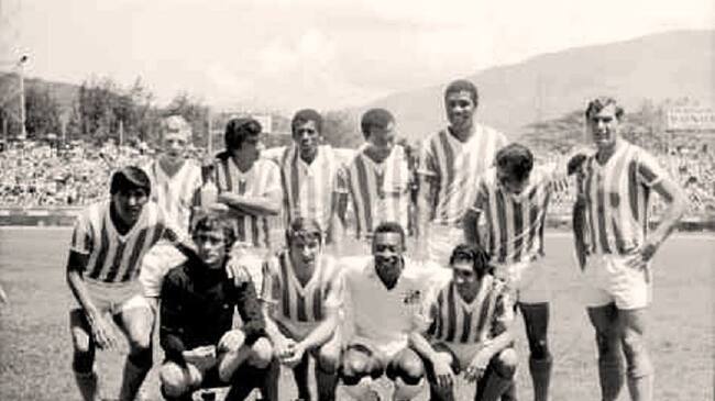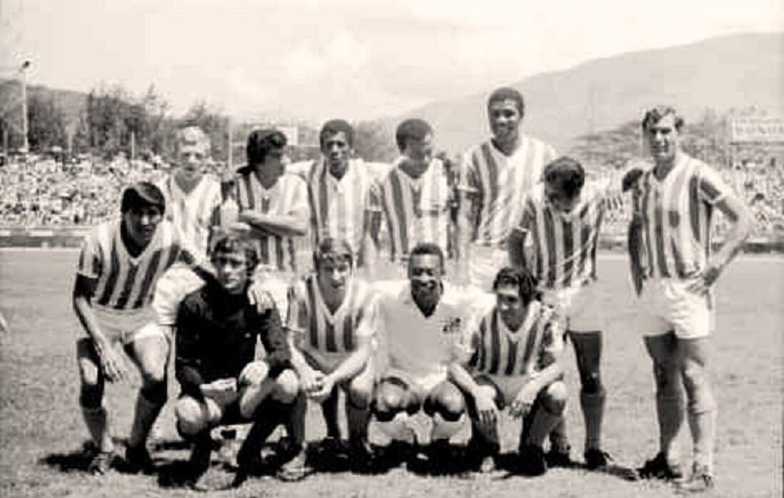 Arriba (Izq-Der) Moncada, Tamayo, Hurtado, Álvarez, Campaz, Osorio, Caliz. (Izq-Der) Tito Gómez, Navarro, Fernández, Pelé y Santa.