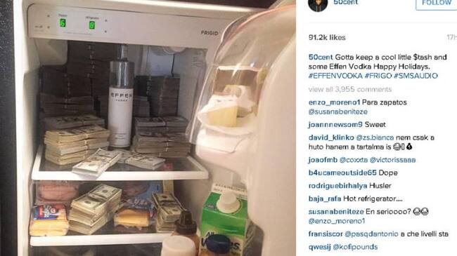 A pesar de que el rapero y actor estadounidense 50 Cent se declaró en quiebra el pasado julio no parece que esté pasando por un momento económico difícil, a juzgar por el vídeo que él mismo ha colgado en Instagram y en el que se le ve abriendo su frigorífico para coger algo de queso, momento en el que deja ver numerosos fajos de dinero apilados entre la comida.