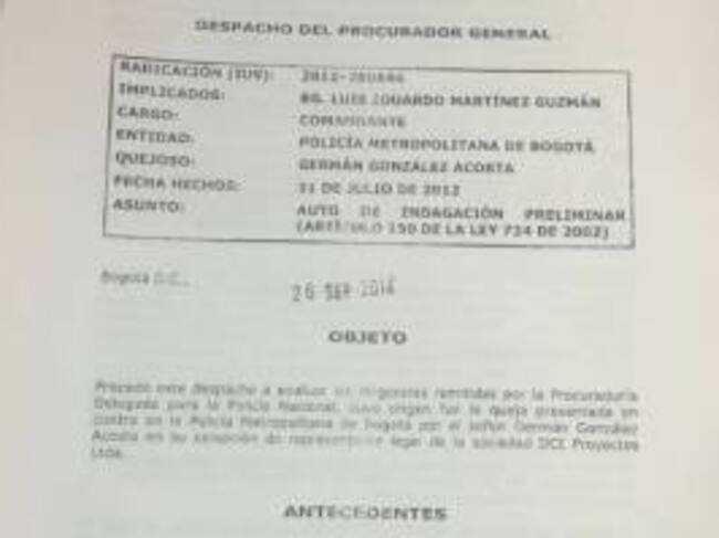 "Ordenar abrir indagación preliminar dentro del radicado Siaf- 162038 contra los servidores públicos brigadier general Luis Eduardo Martínez Guzmán en su condición de Comandante de la Policía Metropolitana de Bogotá (...) con el propósito de establecer el comportamiento disciplinario, (...) determinar si los hechos en comento son constitutivos de faltas disciplinarias" precisa el auto de apertura.