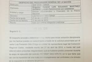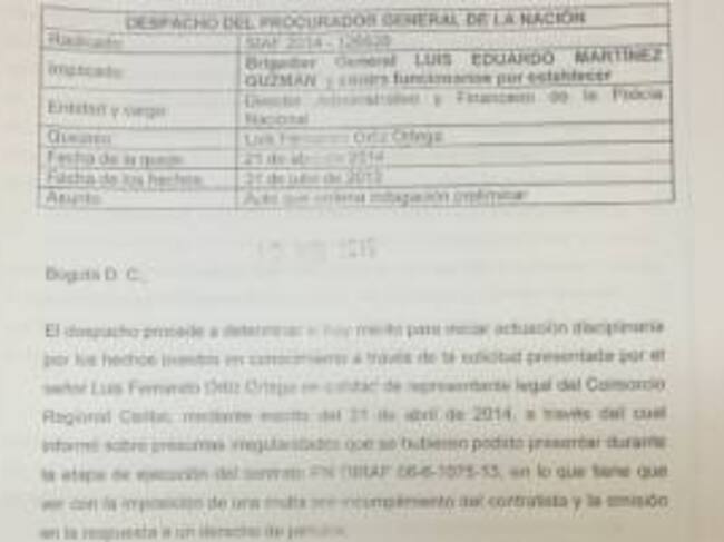 Esta indagación preliminar la abrió el procurador para establecer si es cierto que hubo irregularidades en la ejecución del contrato PN DIRAF 06-6-1075-13, que llevaron al general Martinez ordenar la imposición de una multa por incumplimiento a Luis Fernando Ortiz Ortega.