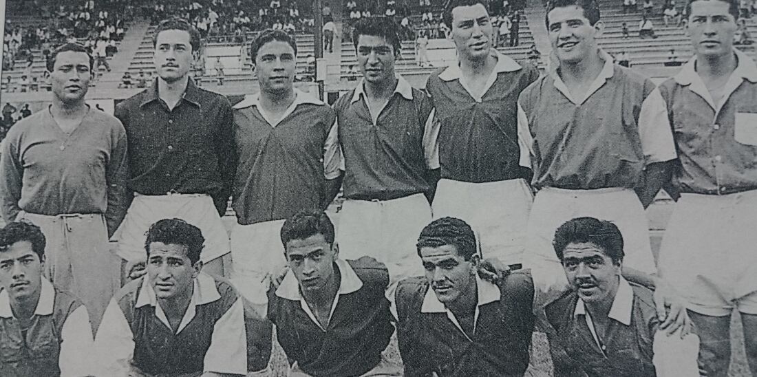 Arriba (Izq-Der) Un auxiliar, Romeo Figueroa, Alfonso Wiesner, José Hermel Hernández, Luis Medina, Hernando Reyes, Joaquín Navarrete. Abajo (Izq-Der) Mario Bustamante, Eugenio Aparicio Castillo, Víctor Vega, Carlos "Mono" Angulo y Miguel "Pecas" Vega.