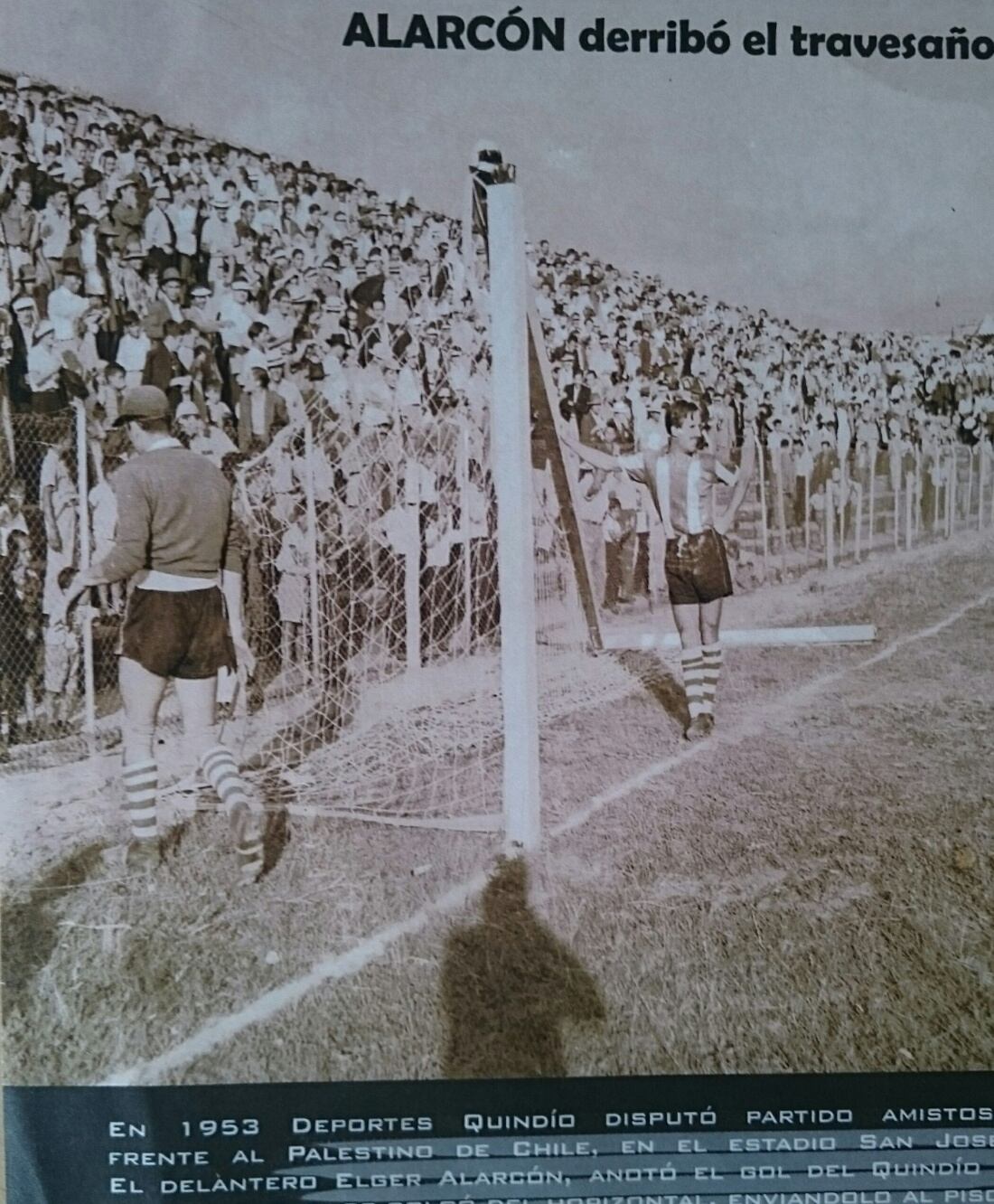En 1953 Deportes Quindío disputó partido amistoso frente al Palestino de Chile, en el estadio San José. El delantero Elger Alarcón anotó el gol del Quindío y al celebrarlo, se colgó del horizontal, enviándolo al piso.