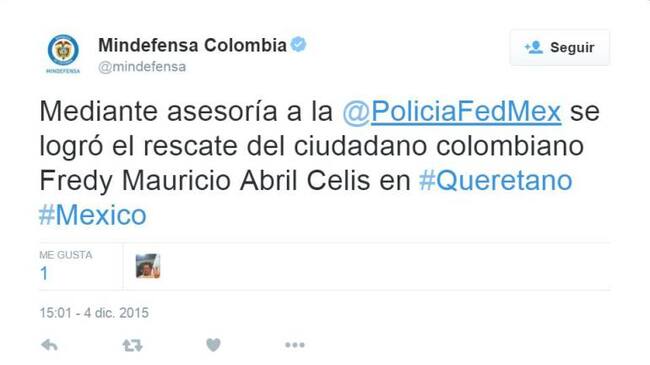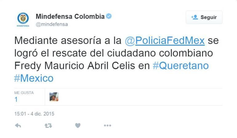 A través de la cuenta de Twitter del Ministerio de Defensa, el Gobierno confirmó la liberación del ciudadano colombiano Fredy Mauricio Abril Celis quien había sido secuestrado tras asistir a una reunión de negocios en ciudad de México.