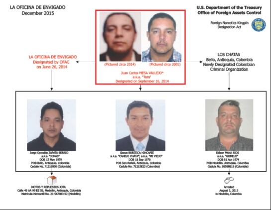 “El poderoso subgrupo Los Chatas está involucrado en el narcotráfico y una serie de crímenes violentos como extorsión, asesinato y robo en nombre de La Oficina de Envigado,” dijo John E. Smith, director interino de la Oficina del Tesoro para el Control de Bienes Extranjeros.