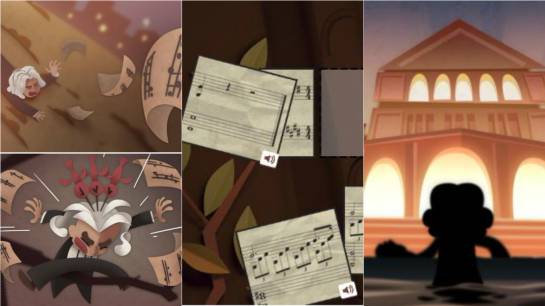 Al iniciar el video se puede ver una animación del compositor en diferentes situaciones en las que pierde las partituras, quien tome el riesgo de organizarlas debe sobrepasar las dificultades del ritmo y la música.