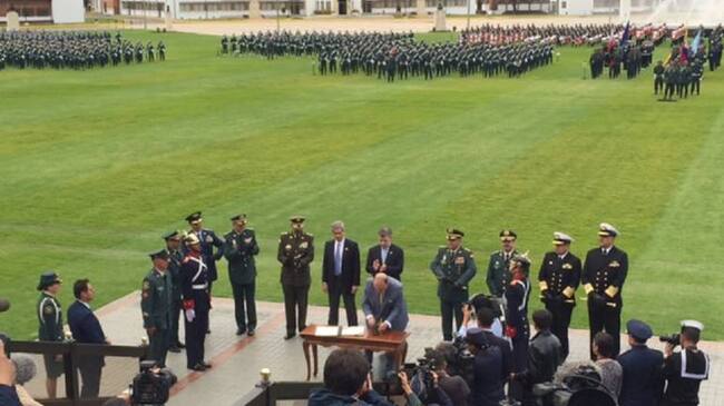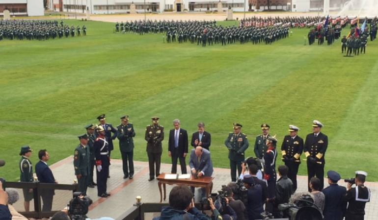 Con la presencia de los generales en retiro Oscar Naranjo y Jorge Mora, plenipotenciarios del Gobierno en La Habana para el proceso de paz, el presidente de la República, Juan Manuel Santos, el ministro de Justicia, Yesid Reyes y de Defensa, Luis Carlos Villegas, firmaron el compromiso de garantías de la justicia transicional para agentes del Estado, para miembros de la fuerza pública.