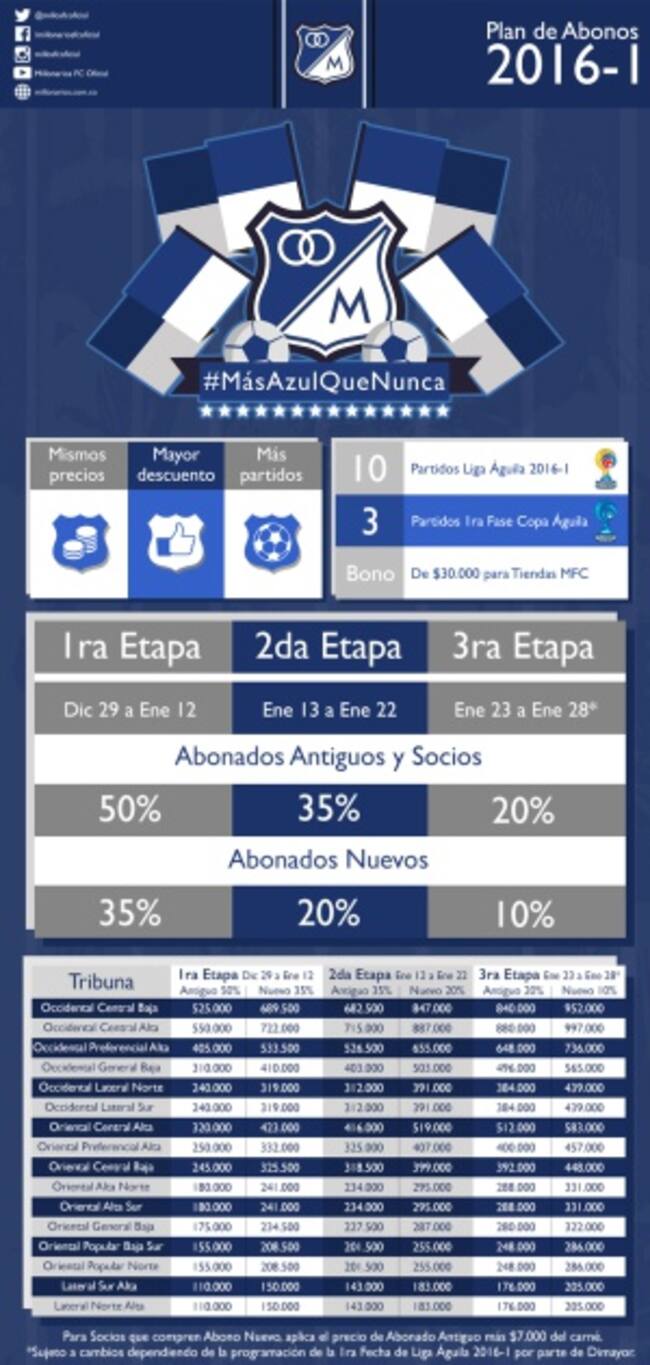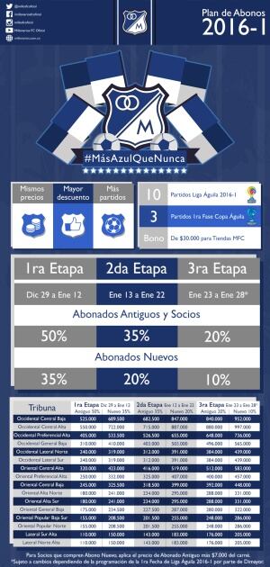 Luego de presentar 11 refuerzos para el primer torneo de 2016, Millonarios ha puesto a la venta sus abonos para la primera mitad del año. Las dirigencias del cuadro capitalino han aplicado descuentos considerables en busca de que su hinchada asista masivamente.