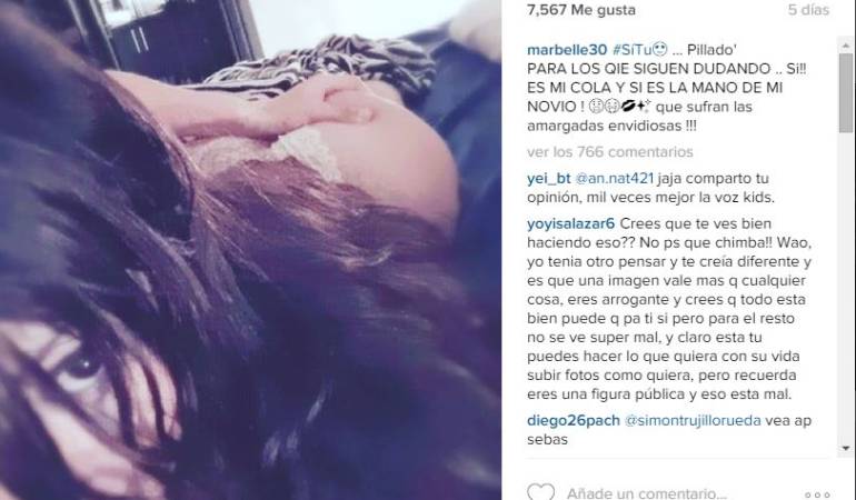 La cantante Marbelle nuevamente es símbolo de controversia. En su cuenta de Instagram publicó una fotografía tomada por ella misma, en la que muestra sus gluteos, tomados por la mano de su novio, el futbolistaSebastián Salazar, de Santa Fe.