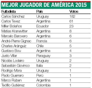 20 años tuvieron que pasar para que un uruguayo volviera a alzarse con el título a mejor jugador de América, entregado por el diario El País, precisamente de Uruguay. Carlos Sánchez, campeón de la Copa Libertadores con River Plate y nuevo hombre del Monterrey de México, se quedó con dicho reconocimiento, superando por 121 votos a Carlos Tevez, el segundo en la lista.