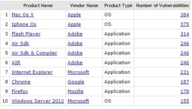 Mac OS X y iOS lidera el Top 50 de los software más vulnerables del 2015, según el informe de CVE Details, con información de la Base de Datos nacional de las vulnerabilidades (NVD, por sus siglas en ingles), sin especificar su gravedad.