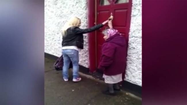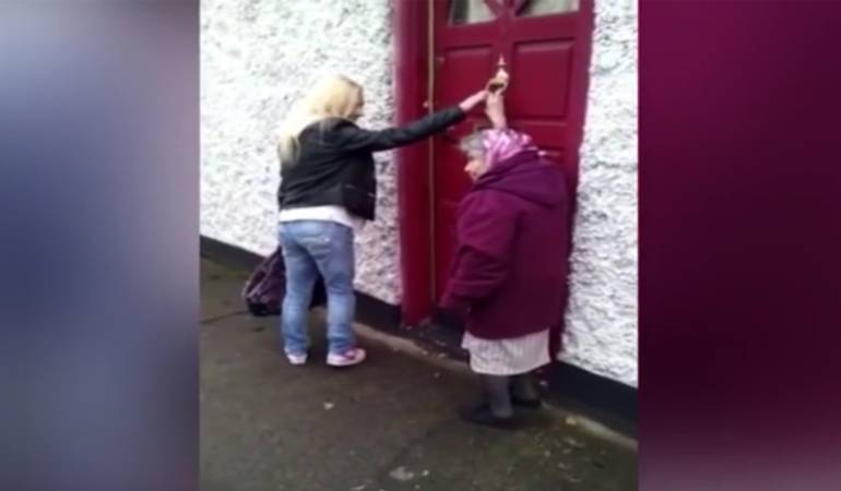 En el video se ve a la irlandesa, de 81 años, acompañada de otra mujer en la puerta de una vivienda, quienes al momento de timbrar huyen del lugar con una carcajada en sus rostros.