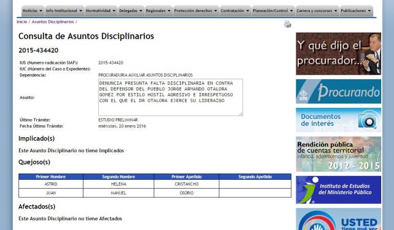 Astrid Helena Cristancho, exsecretaria privada de la Defensoría, Juan Manuel Osorio, ex defensor Delegado para la Orientación y Asesoría a las Víctimas del Conflicto Armado, radicaron en diciembre en el despacho del Procurador, Alejandro Ordóñez, una queja disciplinaria en contra del defensor del Pueblo, Jorge Armando Otálora, por presunto acoso laboral.