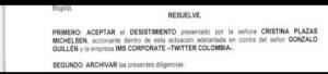 Plazas esperará entonces a que Guillen presente una rectificación para continuar con la tutela, sin embargo, mientras eso ocurre el juzgado desistió de la acción judicial y archivo el proceso.