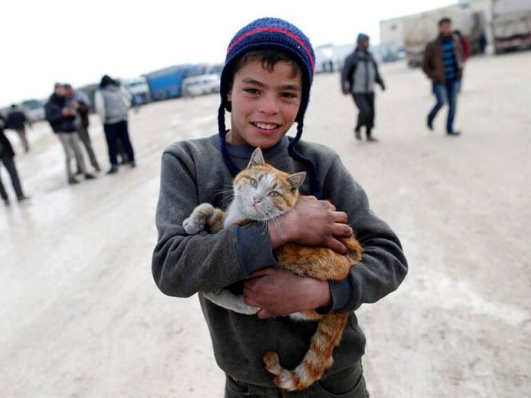 Refugiados sirios que huyen de Alepo esperan en un campamento cerca del cruce de la frontera turca.