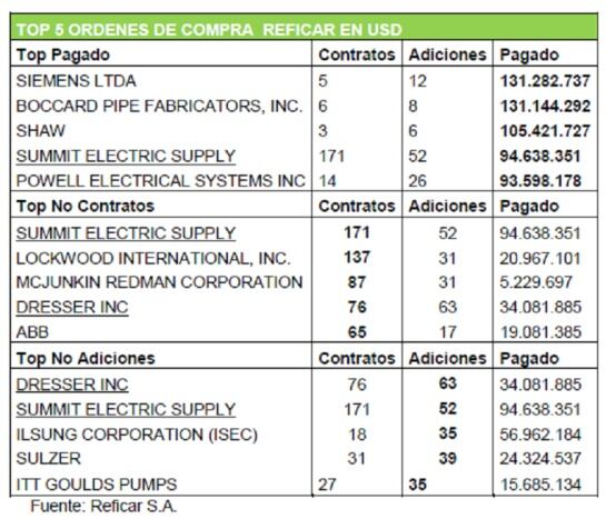 A esto se suma el Top 5 de los subcontratistas en dólares. Según información de Reficar, al 11 de noviembre de 2015 se han realizado 533 contratos, 147 adiciones y se ha pagado un total de 2,029 millones de dólares. En Euros se han realizado 11 contratos, 54 adiciones y se ha pagado un total de 3,7 millones de Euros.