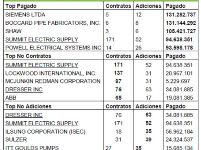 Además de los subcontratistas en Reficar se encontraron 395 órdenes de compra a diferentes proveedores y 55 adiciones. Hasta noviembre de 2016 se había pagado un total de 222,393 millones de pesos.