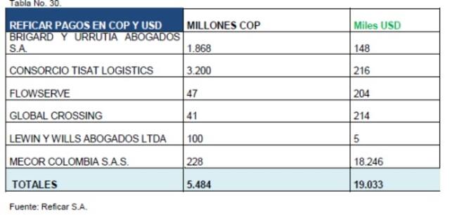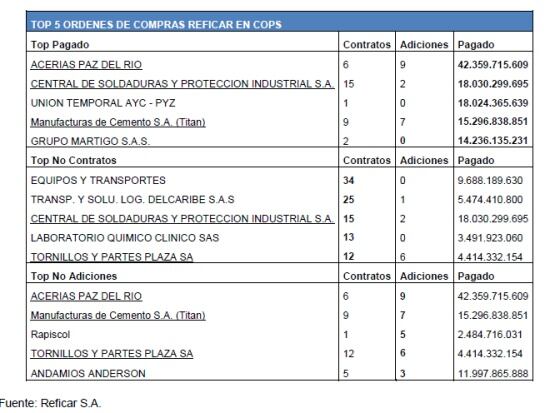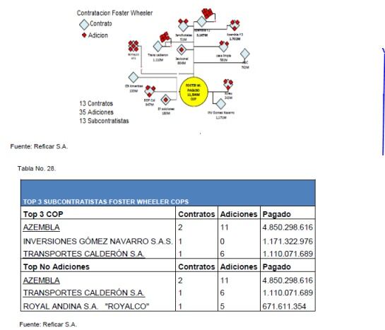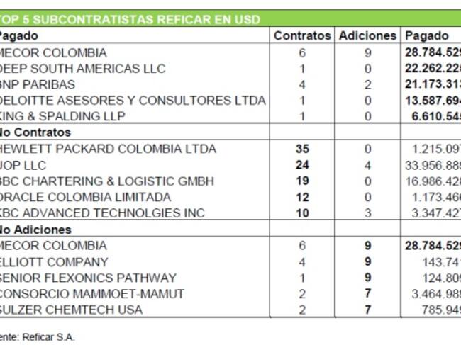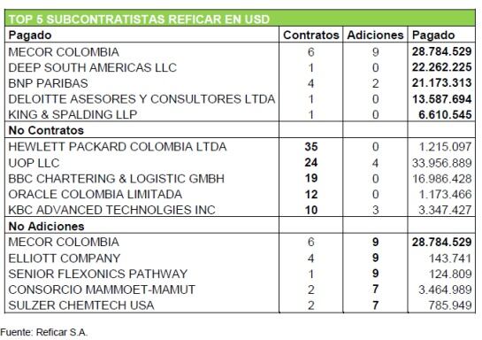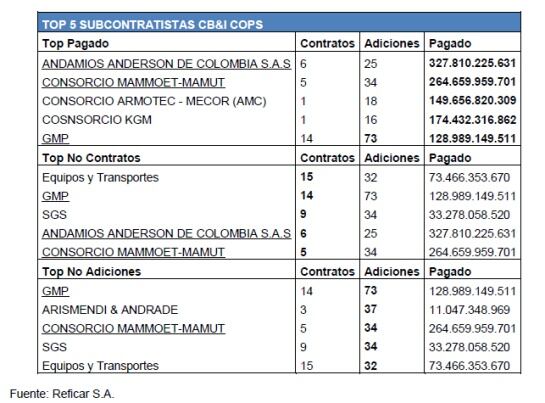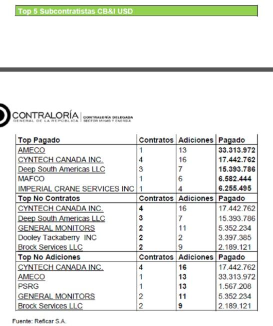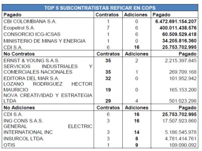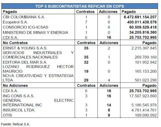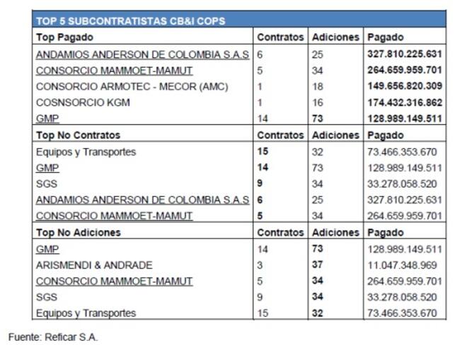 El informe de la Contraloría, que encontró sobrecostos iniciales en la ampliación de Reficar por U$4.000 millones de dólares, identificó el TOP 5 de los subcontratistas en pesos colombianos. Según información de la prensa al 11 de noviembre del 2015, se han realizado un total de 1,846 Contratos denominados en Pesos Colombianos con 516 adiciones, y se ha pagado un total de 7,3 Billones de pesos.