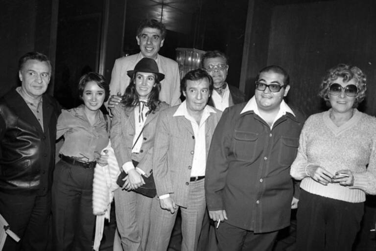 Roberto Gómez Bolaños más conocido como Chespirito junto a su elenco en la Caminata de la Solidaridad en Colombia en 1981.