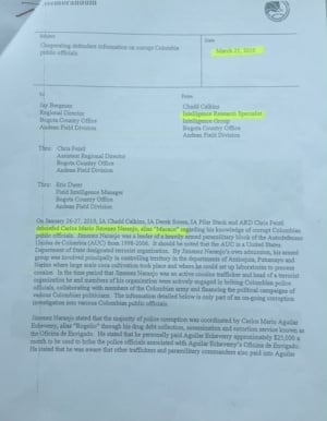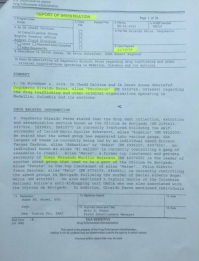 El reporte más comprometedor, tiene fecha marzo de 2011. El mayor de la Policía, ya en retiro Byron Ernesto Ordoñez le contó a los agentes de la DEA que los sobornos incluyeron a generales como José Roberto León Riaño, Oscar Naranjo y Rosso José Serrano, Leonardo Gallego Castrillón, quien fuera director Antinarcóticos, Dagoberto García Cáceres, César Augusto Pinzón, el ya fallecido coronel Danilo Gonzáles y el entonces coronel Luis Eduardo Martínez.
