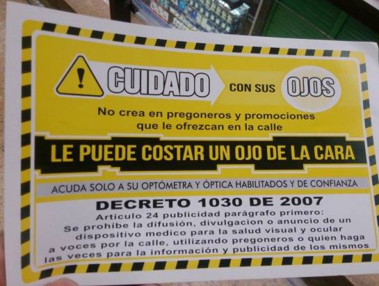 Pese a que el Ministerio de la Protección Social, había reglamentado en 2007, por medio del decreto 1030, el comercio de elementos ópticos, cada vez se ha vuelto más común encontrar por la calle lugares donde se puede conseguir gafas para lectura que vienen ya con formula médica, incluso algunos almacenes de cadena han comenzado a ofrecerlas dentro de sus productos.
