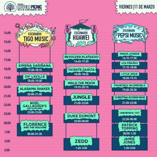 Luego de una jornada que dejó grandes momentos musicales de la mano de artistas como Die Antwoord, Bad Religion, Mumford & Sons y Tame Impala, llega un nuevo día del Festival Estéreo Picnic 2016 con la presentación de una gran cuota de latinos mezclada con nombres de la talla de Florence and The Machine, Alabama Shakes, Zedd, Noel Gallagher's High Flying, entre otros.