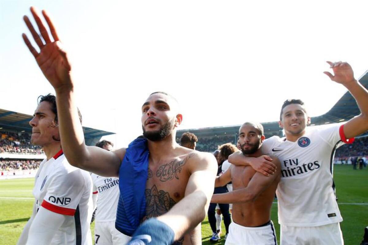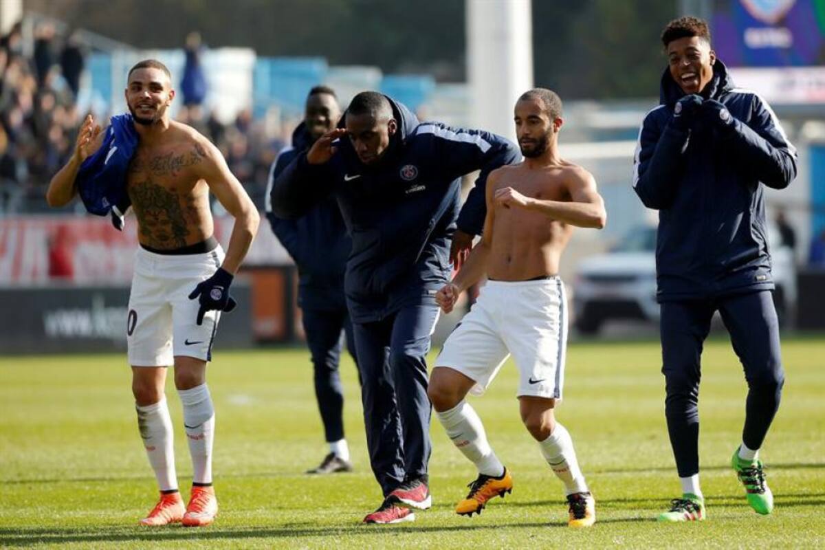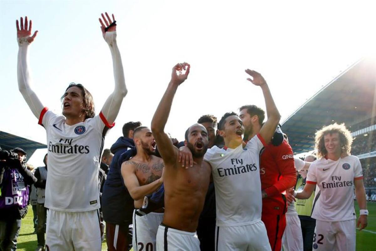 • Jugadores París Saint Germain celebran el título de la Ligue 1 después de su victoria 9-0 durante la Ligue 1 emparejamiento de fútbol francesa entre Estac Troyes y París Saint-Germain.