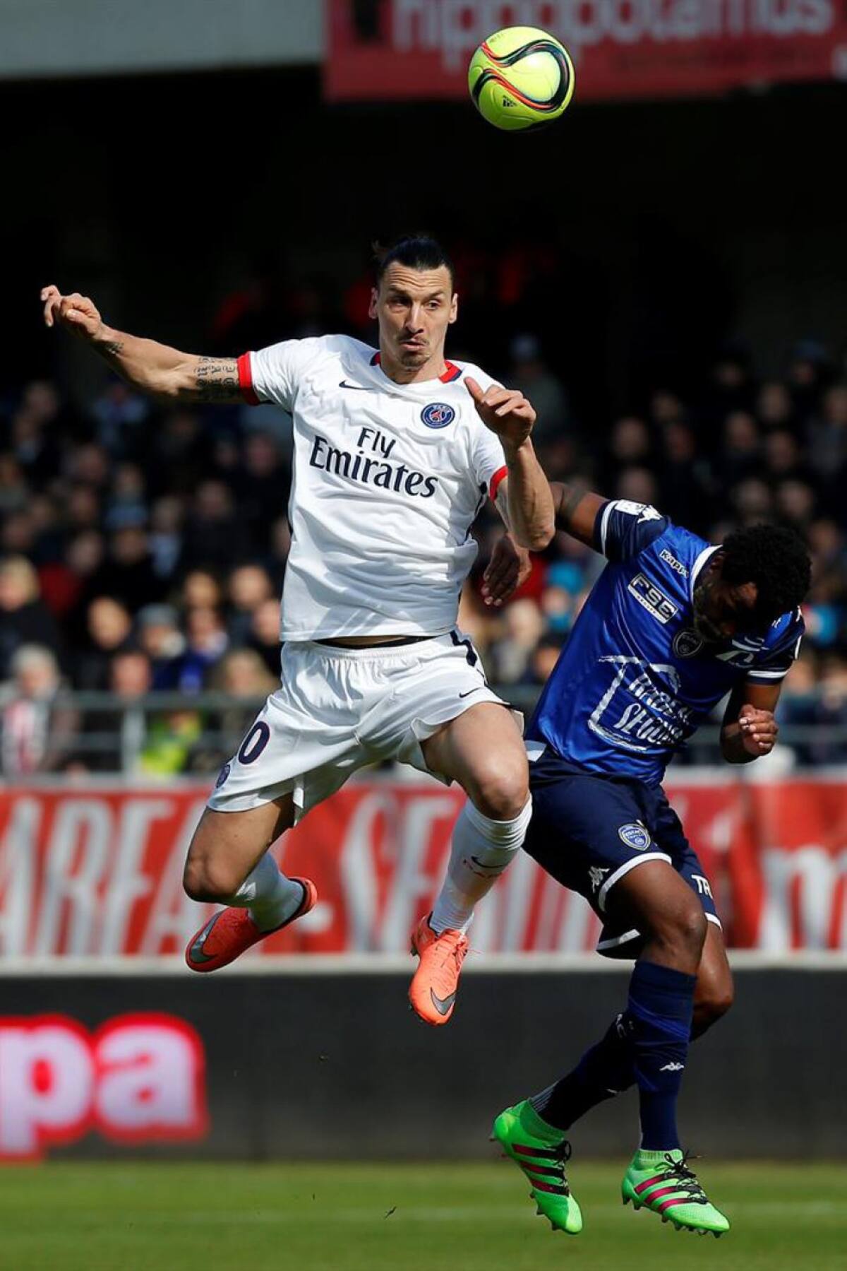 • Zlatan Ibrahimovic ( L ) de París Saint Germain compite por el balón con Rincón ( R ) de Troyes durante la Ligue 1 emparejamiento de fútbol francesa entre Estac Troyes y París Saint-Germain (PSG).