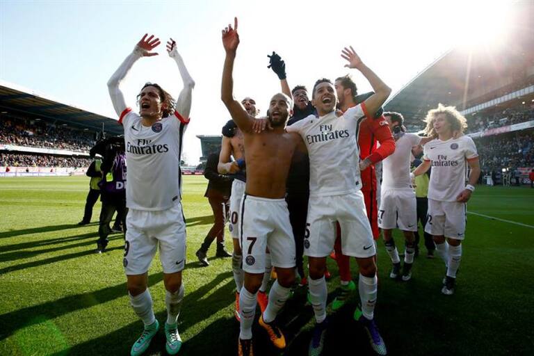 • Jugadores París Saint Germain celebran el título de la Ligue 1 después de su victoria 9-0 durante el partido de fútbol de la Ligue 1 francesa entre Estac Troyes y París Saint-Germain (PSG).