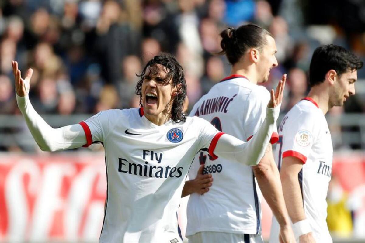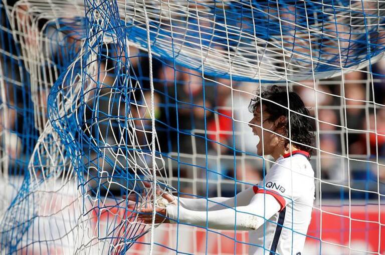 • Edinson Cavani de París Saint Germain celebra después de anotar durante la Ligue 1 emparejamiento de fútbol francesa entre Estac Troyes y París Saint-Germain (PSG).