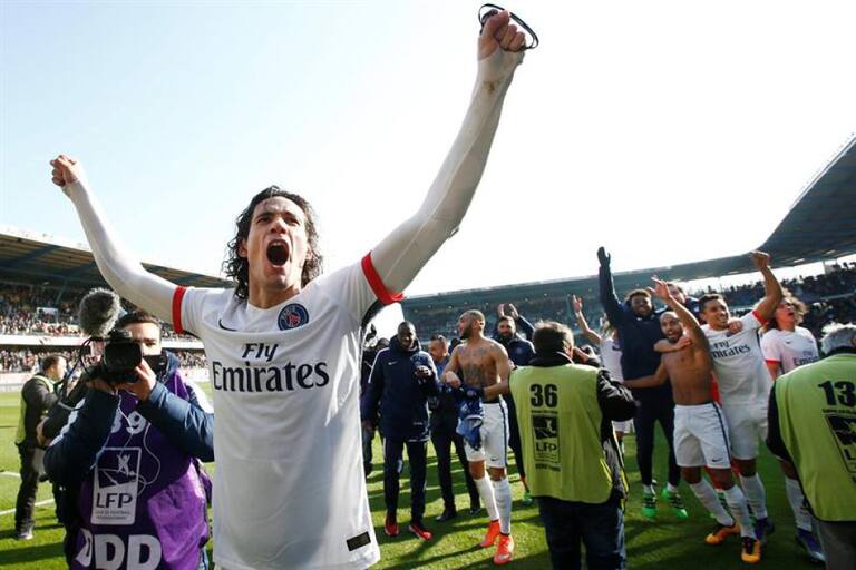 • Edinson Cavani de París Saint Germain celebra el título de la Ligue 1 después de su victoria 9-0 durante el partido de fútbol de la Ligue 1 francesa entre Estac Troyes y París Saint-Germain (PSG).