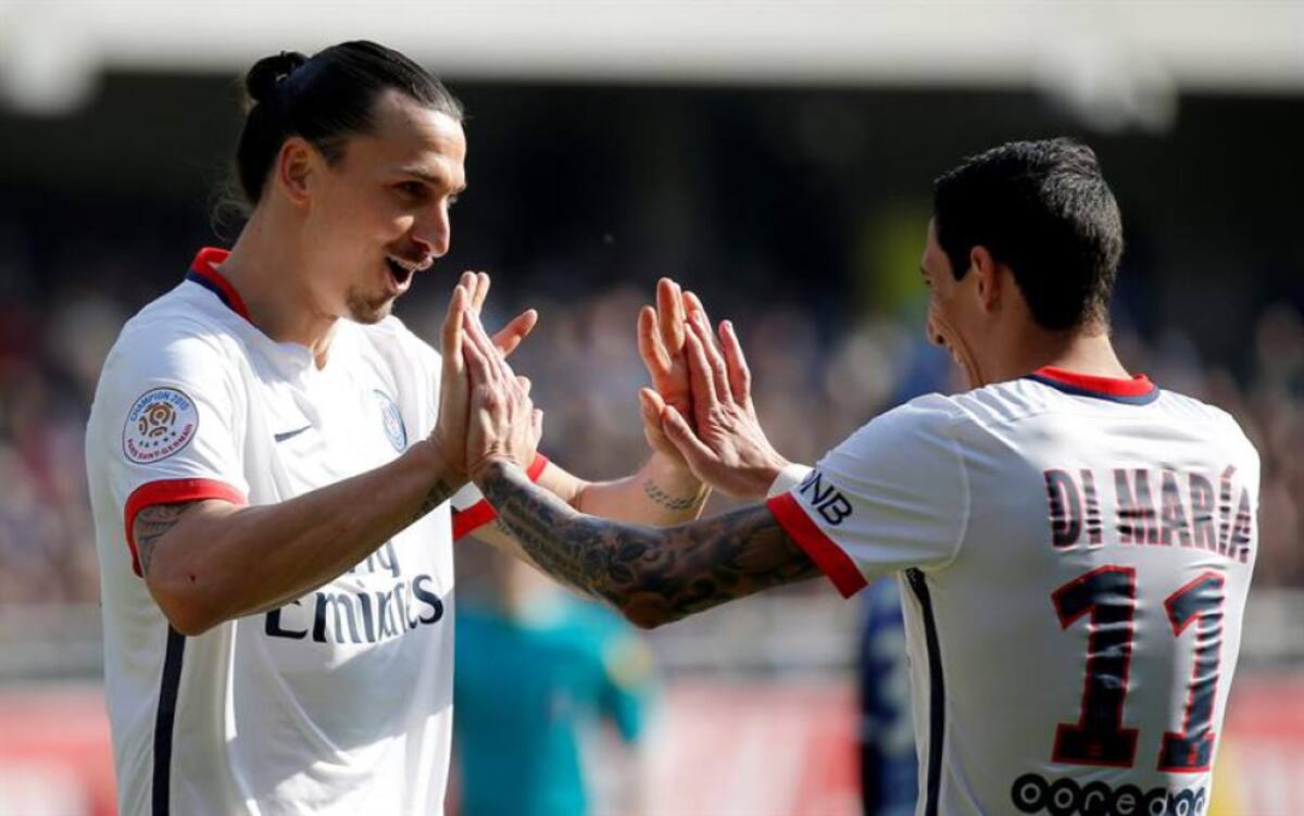 • Zlatan Ibrahimovic (L) de París Saint Germain celebra con su compañero de equipo Ángel Di María (R) después de anotar durante el partido de fútbol de la Ligue 1 francesa entre Estac Troyes y París Saint-Germain.