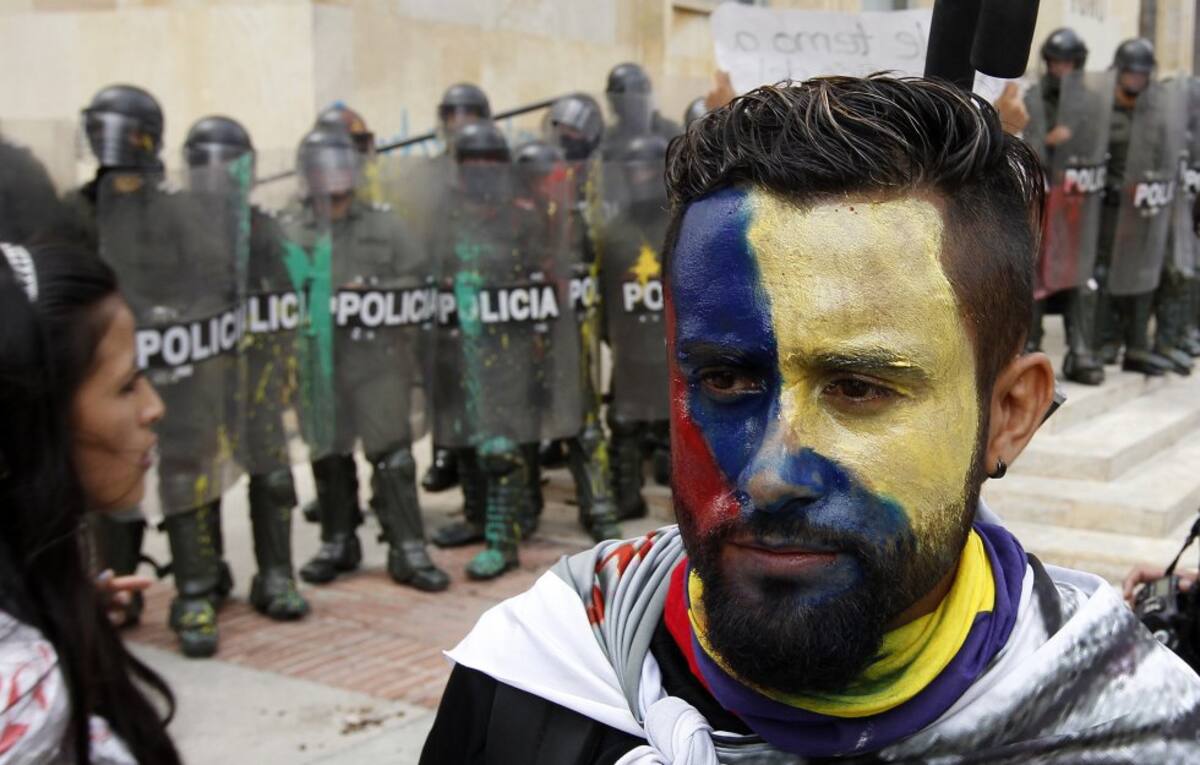 Manifestantes marchan y gritan consignas contra el gobierno, en Bogotá. El Gobierno colombiano informó hoy que la huelga nacional que convocaron 46 organizaciones sociales, sindicales, de camioneros y taxistas transcurre en un ambiente de "tranquilidad" en todo el país.