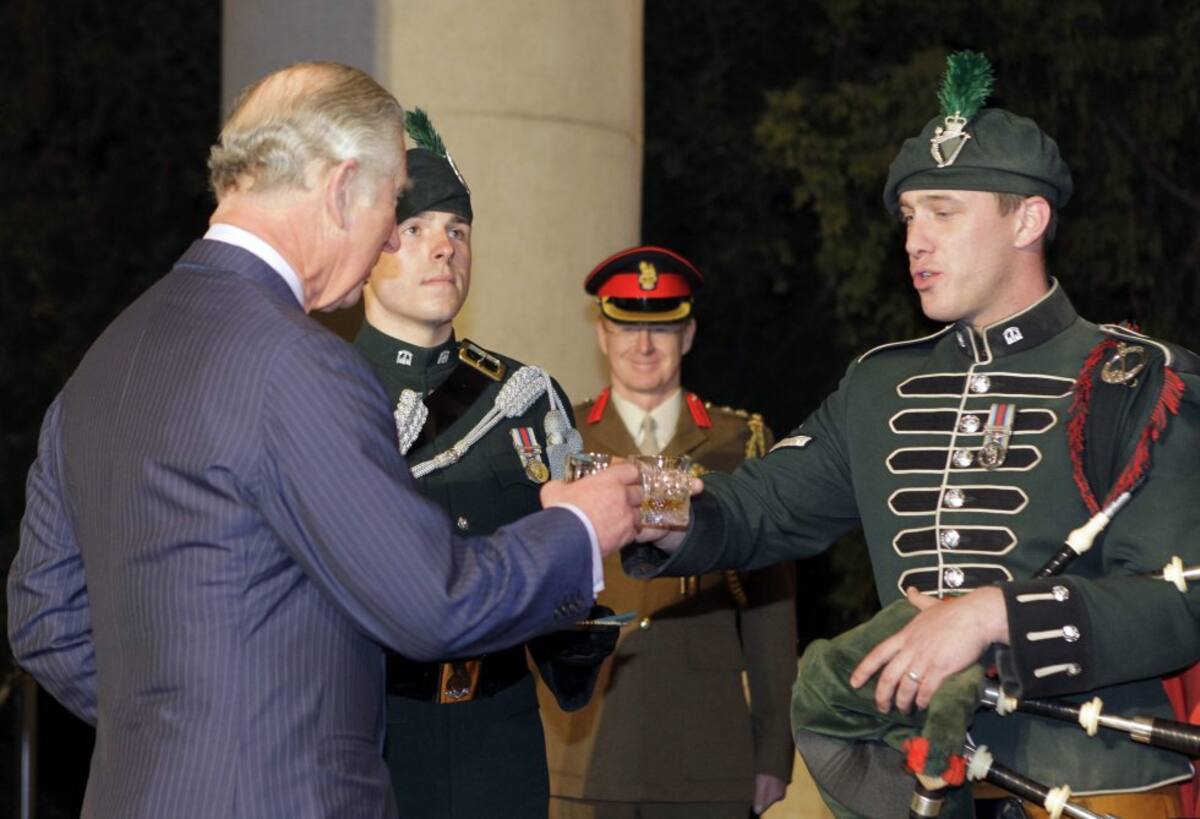 El príncipe Carlos de Inglaterra brinda con un miembro del Regimiento Real Irlandés antes de su visita al parlamento de Belgrado, Serbia.
