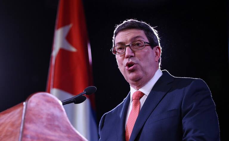 El canciller cubano, Bruno Rodríguez, habla en una rueda de prensa en La Habana, donde anunció que el Gobierno de Cuba ha decidido eliminar el gravamen del 10% que aplica al dólar estadounidense.