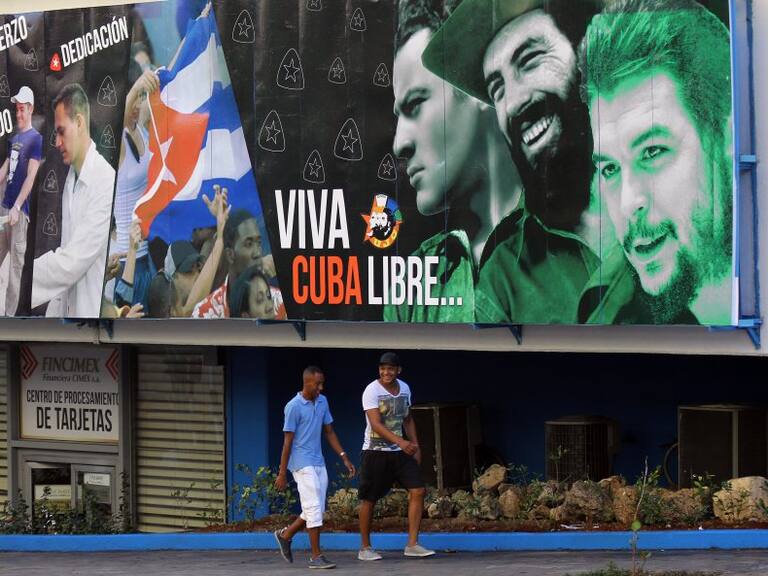 Dos cubanos caminan en una calle de La Habana (Cuba).