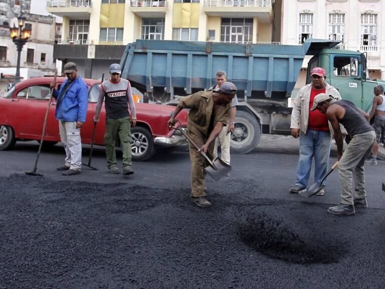 Trabajadores realizan reparaciones de una calle junto al Prado habanero en La Habana (Cuba).