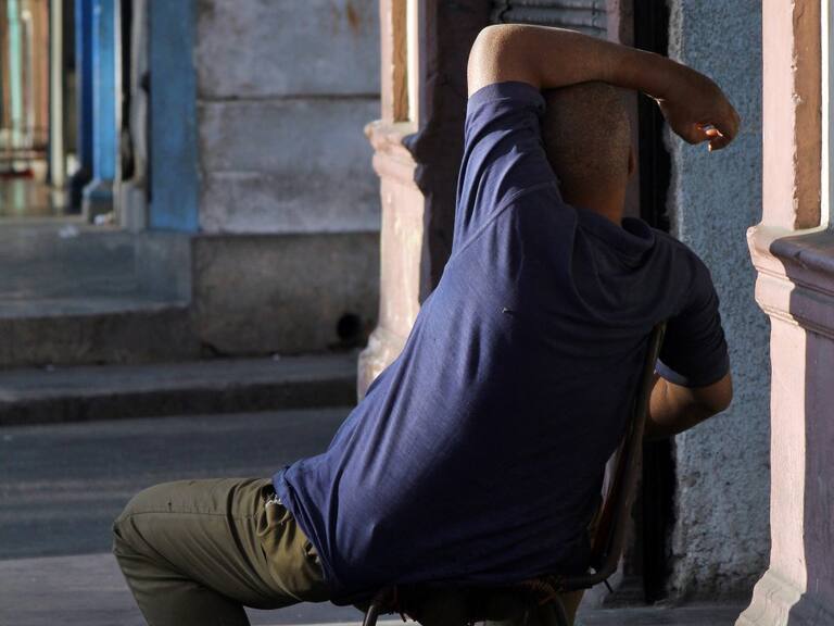 Un hombre junto a su gato descansa en una calle de La Habana (Cuba).