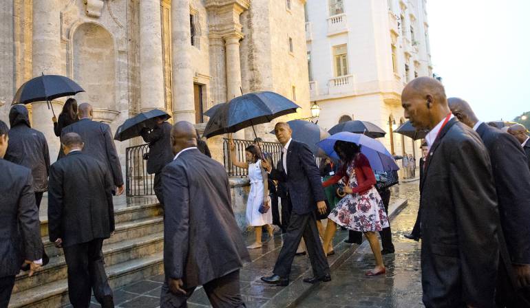 El presidente de Estados Unidos, Barack Obama, junto a su esposa Michelle y sus hijas Sasha y Malia, visitaron La Habana Vieja, el centro histórico de la capital de Cuba, un paseo que tuvieron que realizar protegidos por paraguas debido a la lluvia que les ha recibido en la ciudad.